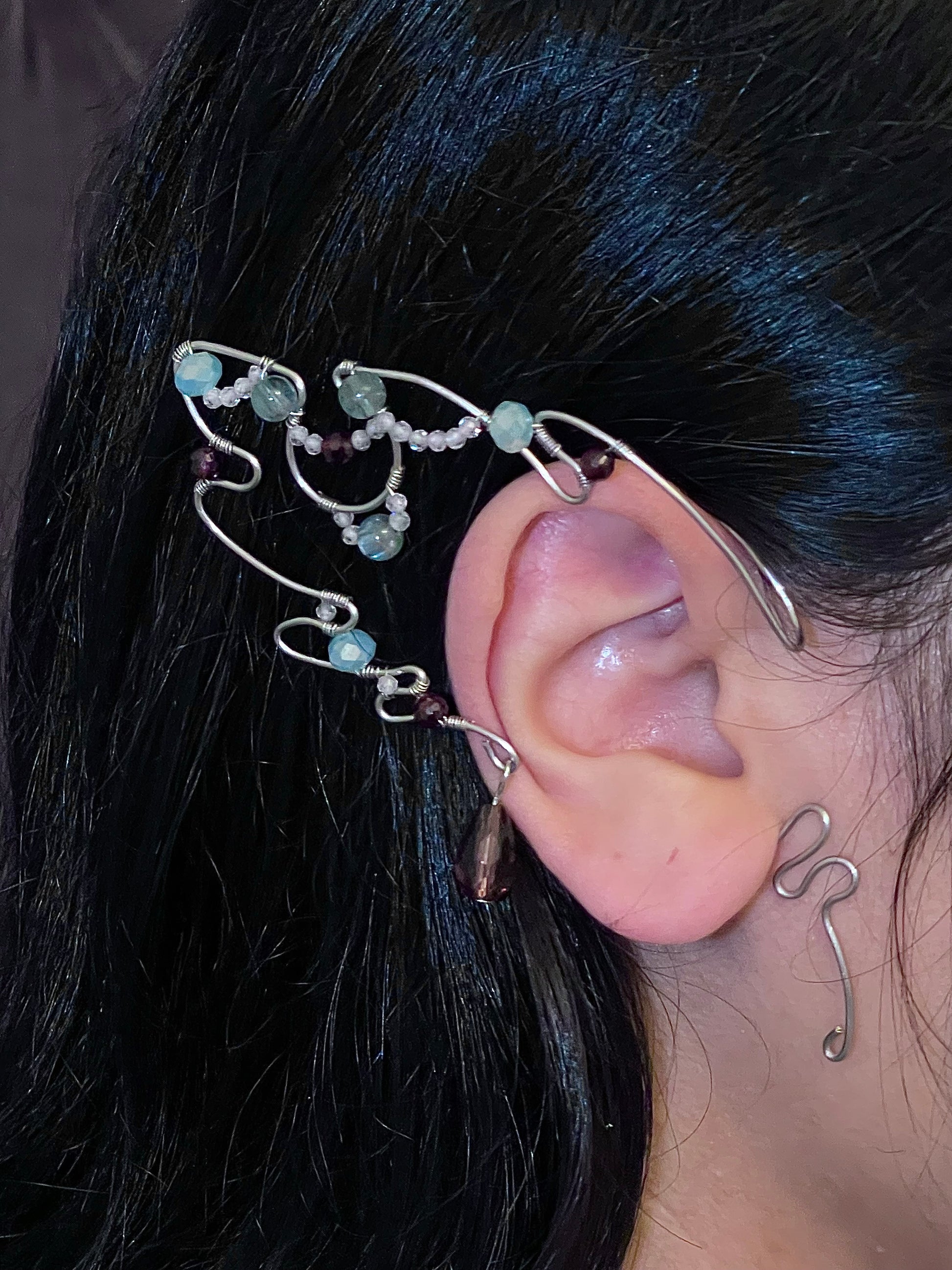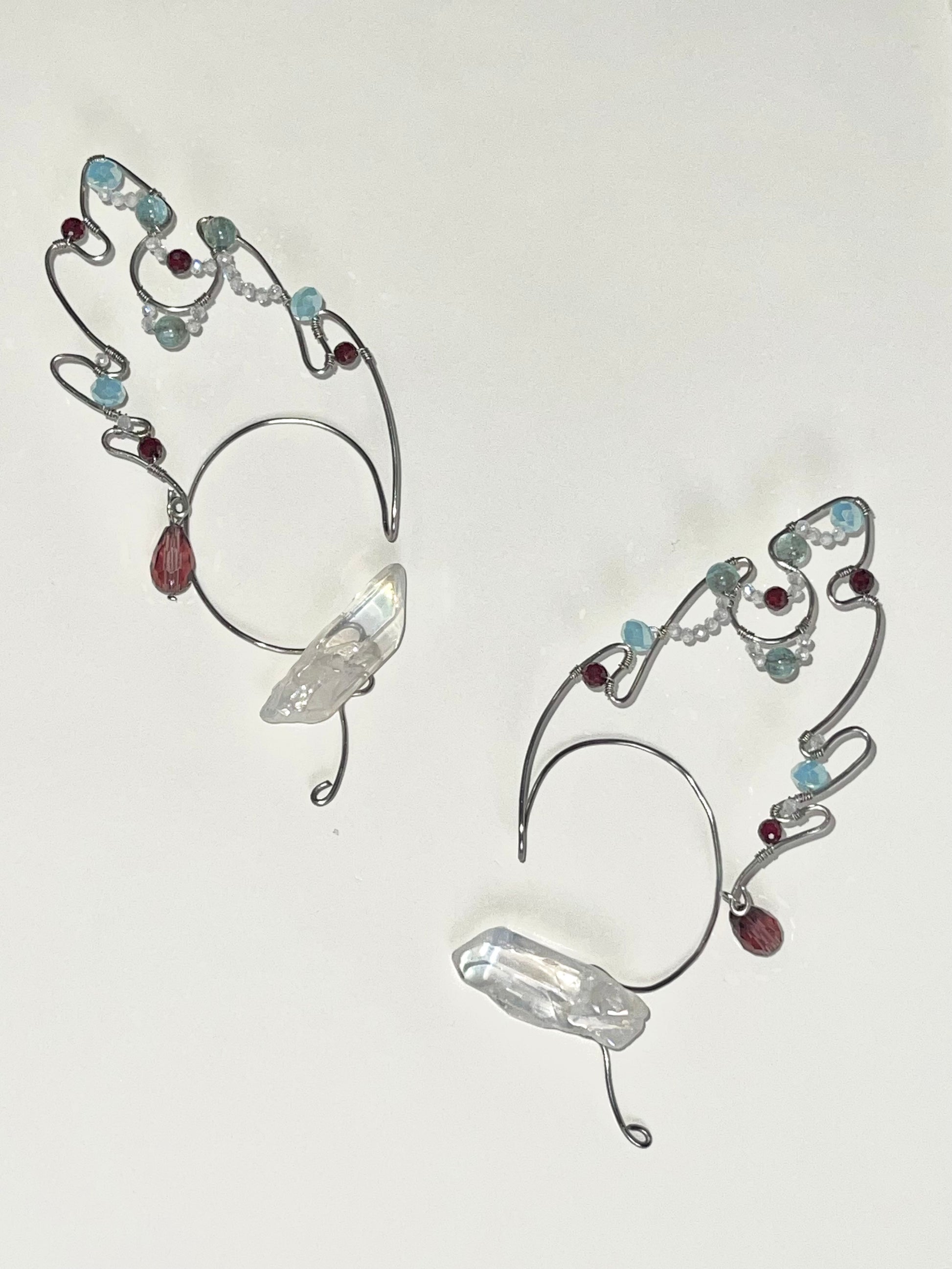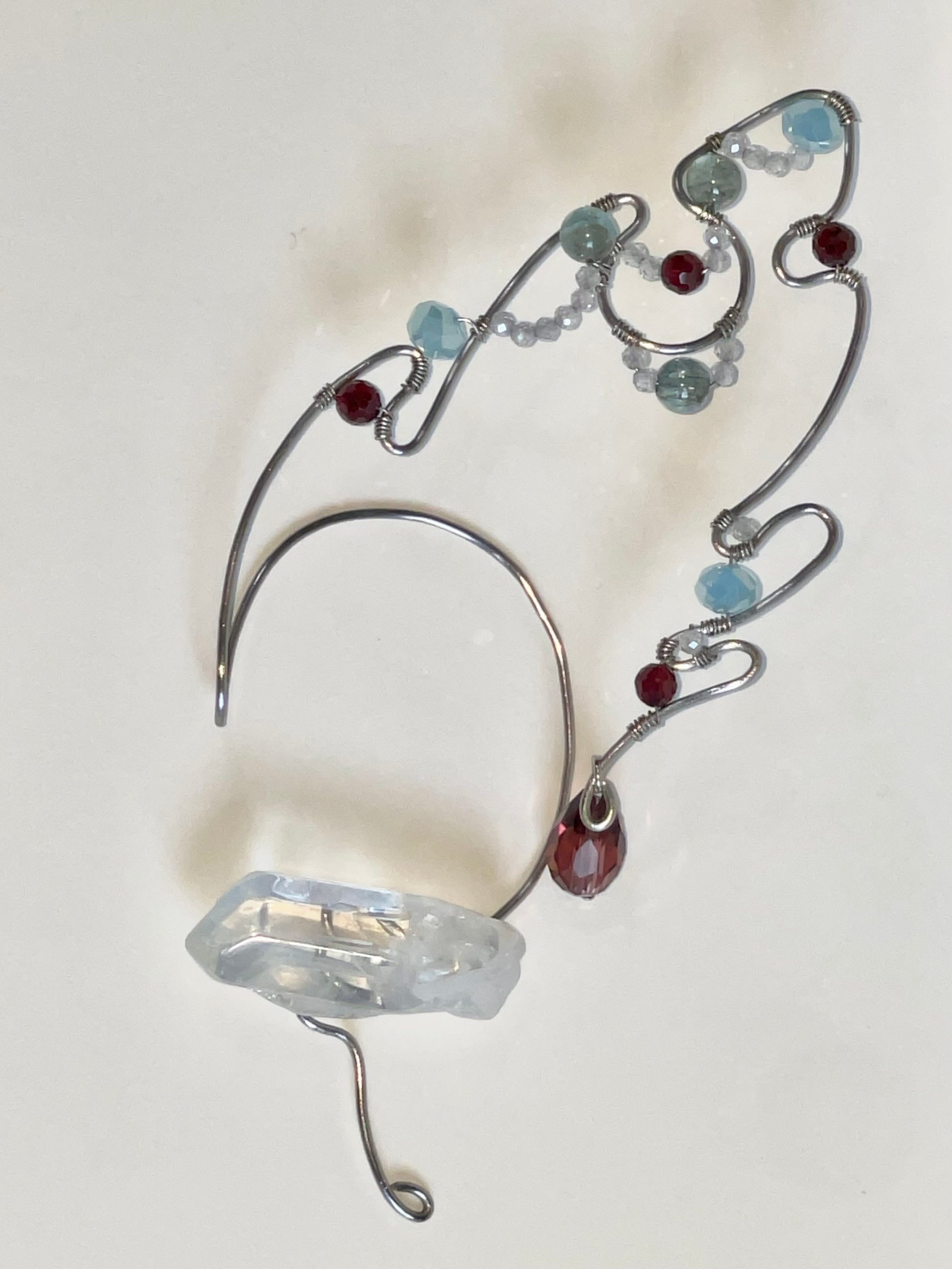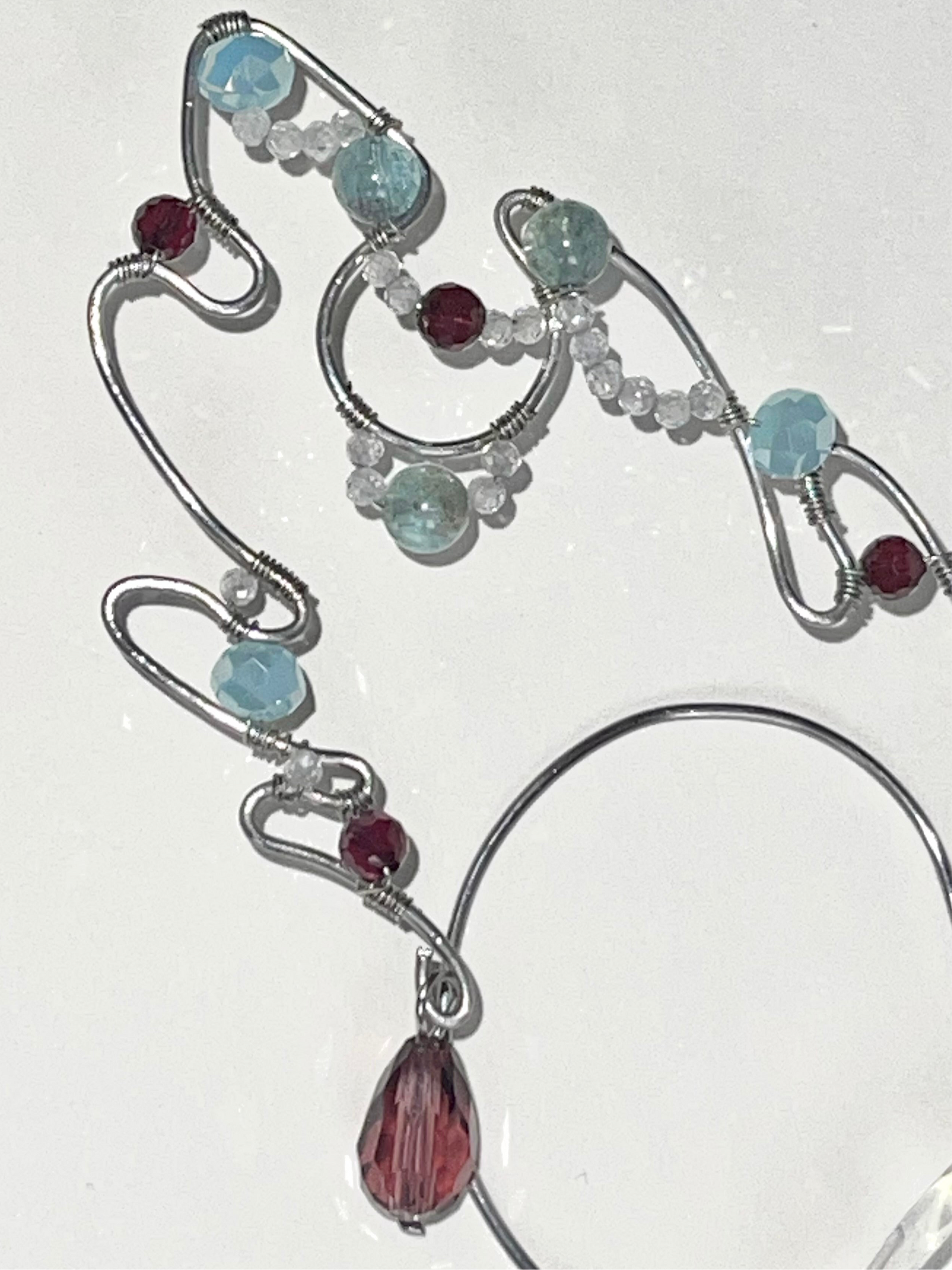 Made With Stainless Steel Wire, Aqua Blue Apatite, Red Garnet, Zircon, Red Tear drop Crystal Bead, And Blue Glass Bead.