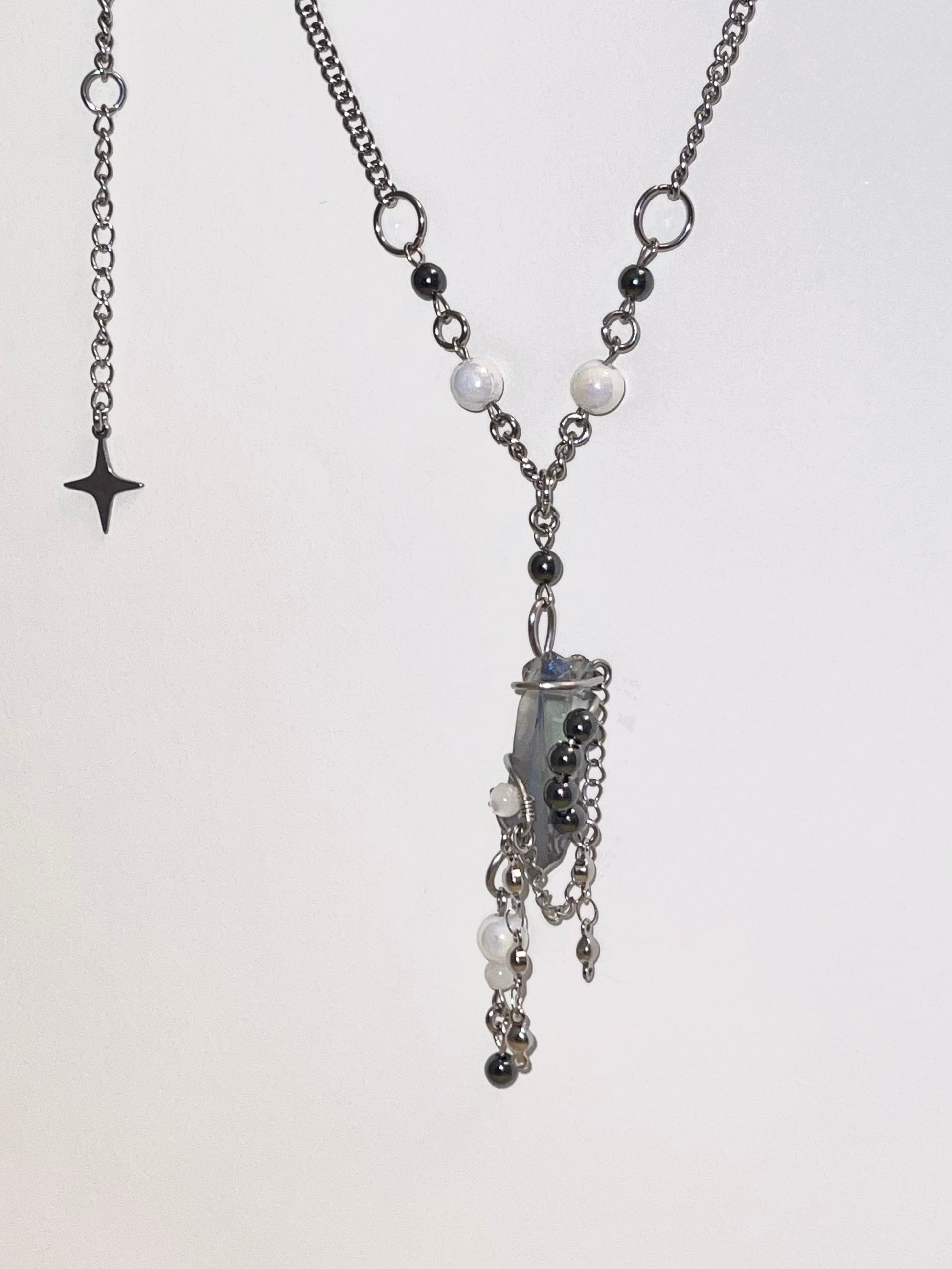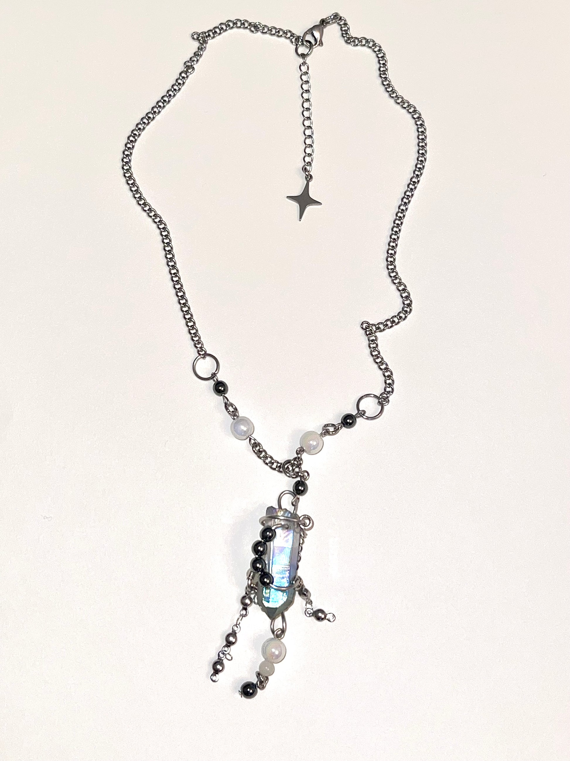 Made With Stainless Steel Chain, Stainless Steel Wire, Silver Plated Copper Wire, Black Hematite Beads, Clear Lavender Titanium Quartz, White Pearl Shell, White Porcelain Beads, And Stainless Steel Chains.