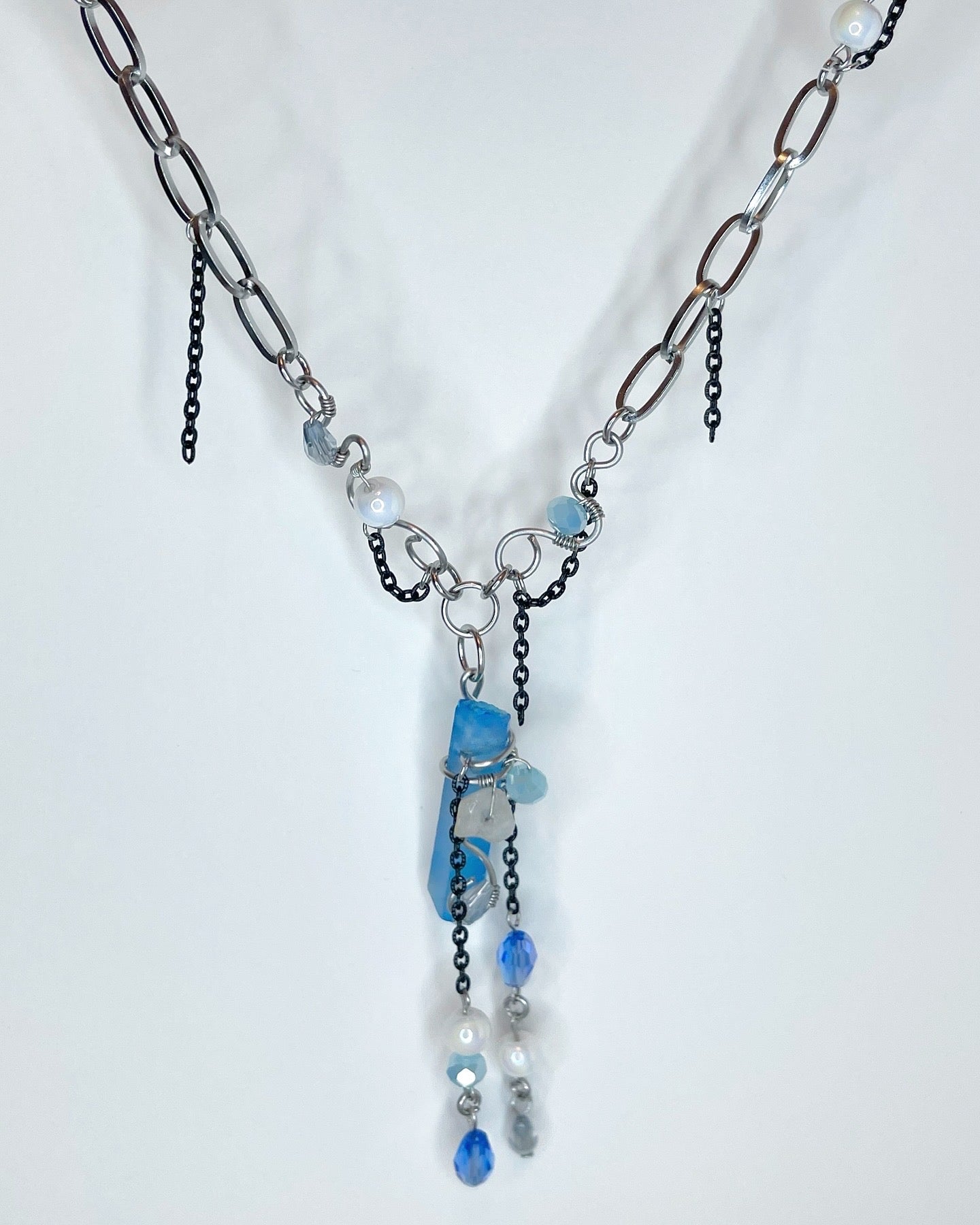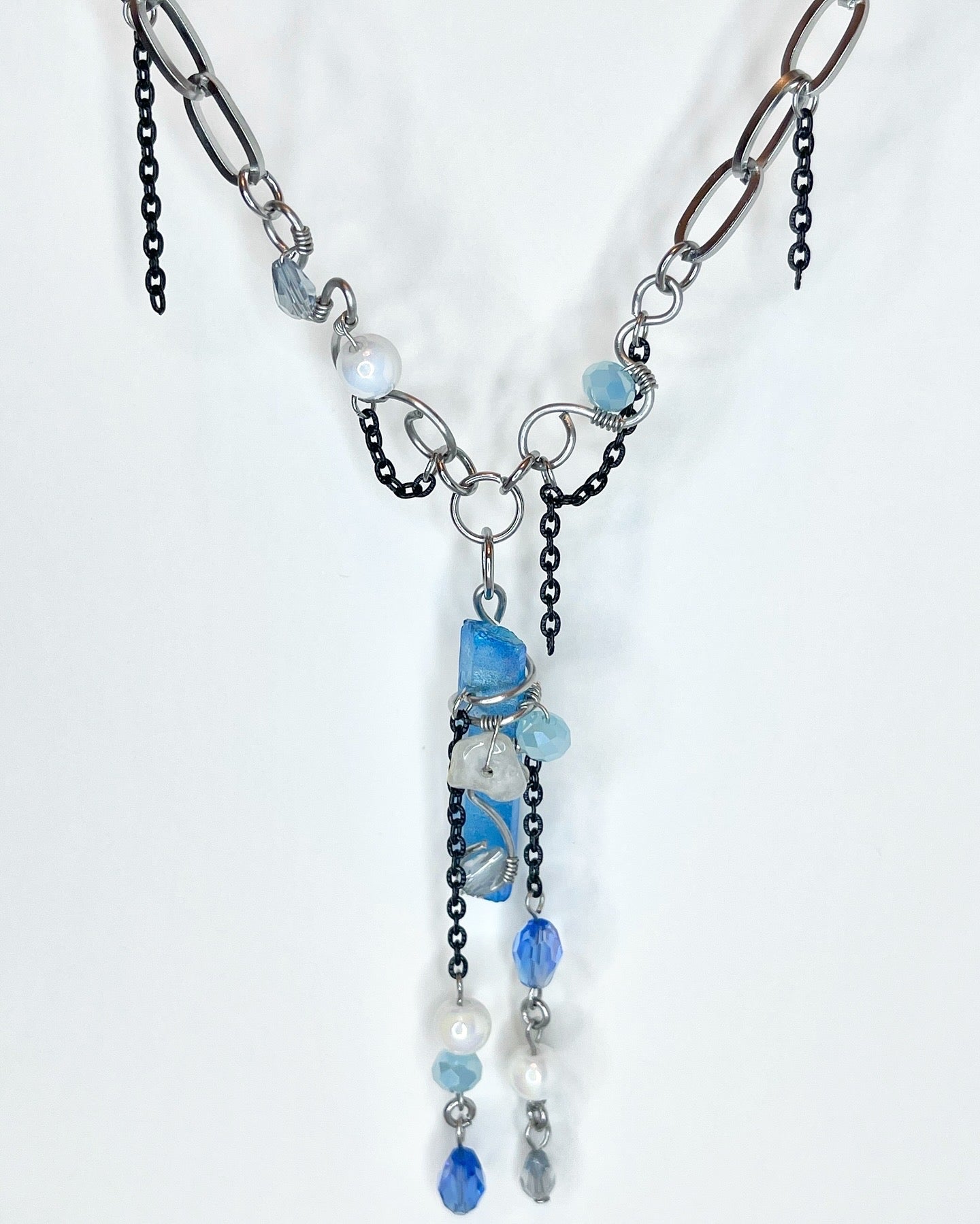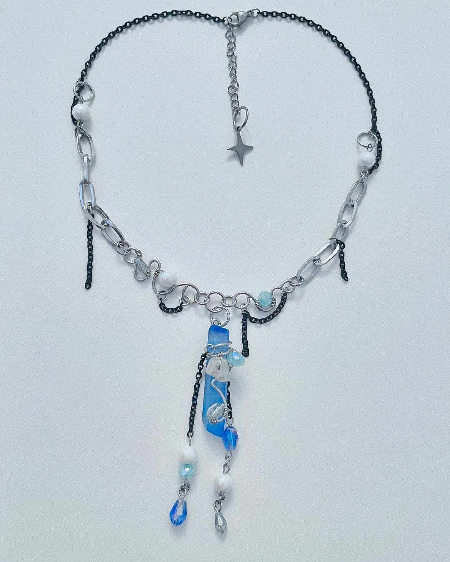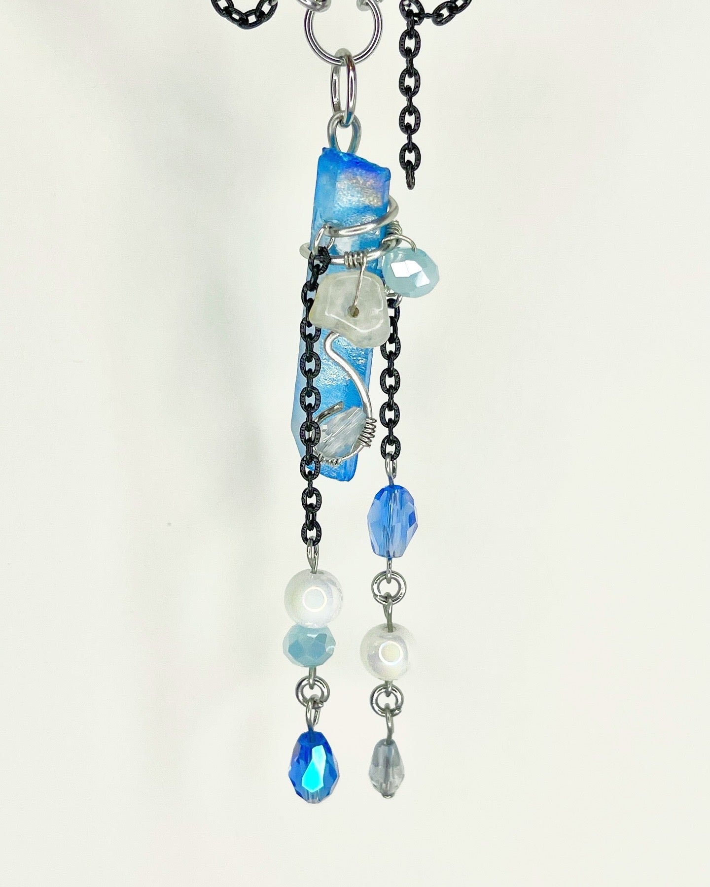 Made With Stainless Steel Chain, Stainless Steel Wire, Black Stainless Steel Chain, White Porcelain Beads, Blue Glass Beads, Dark Blue Tear Drop Beads, Clear Quartz, Gray Tear Drop Beads & Blue Titanium Quartz.
