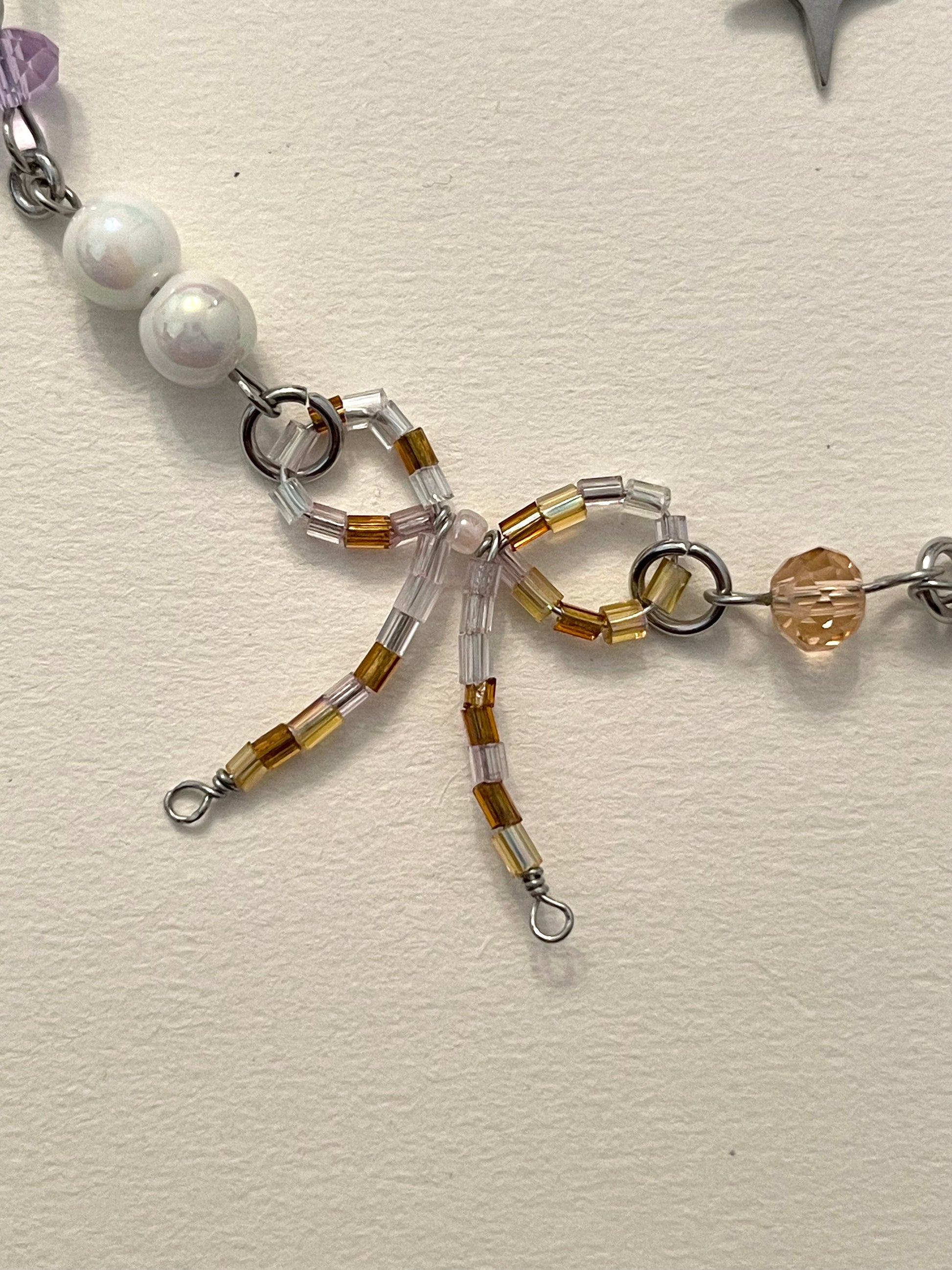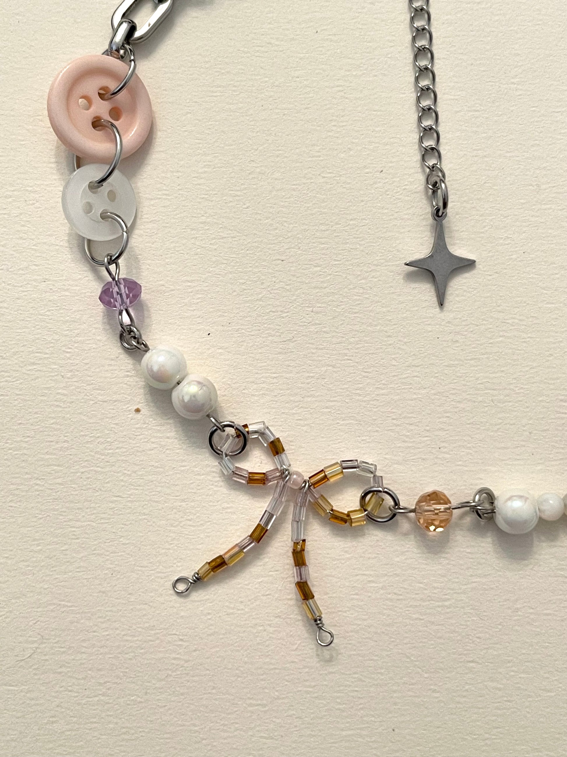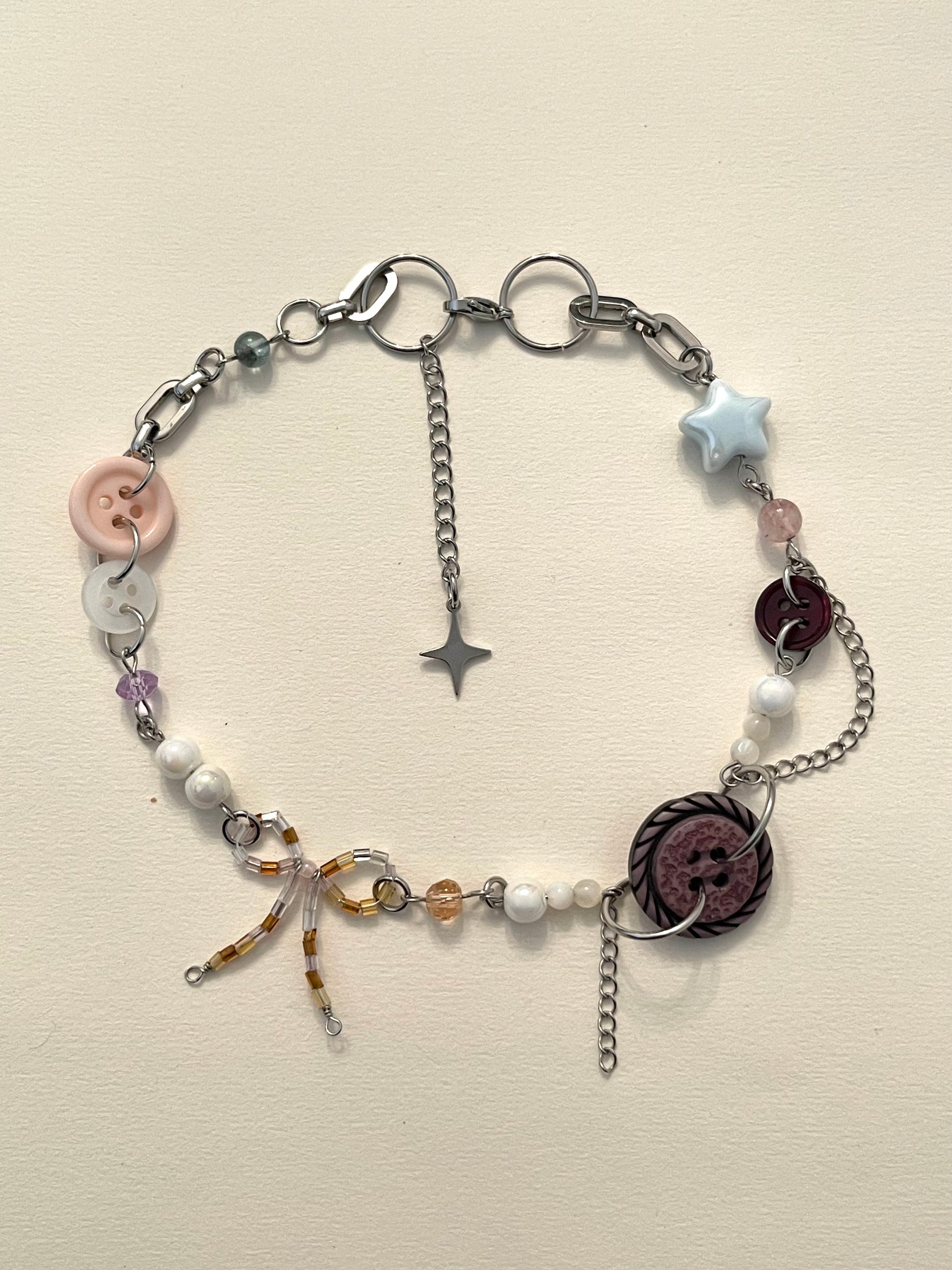 Made With Buttons, White Porcelain Beads, White Pearl Shell, Strawberry Quartz, Aqua Blue Apatite, Blue Star Porcelain Bead, Purple Glass Bead, Orange Glass Bead, Glass Beads Bow Charm.