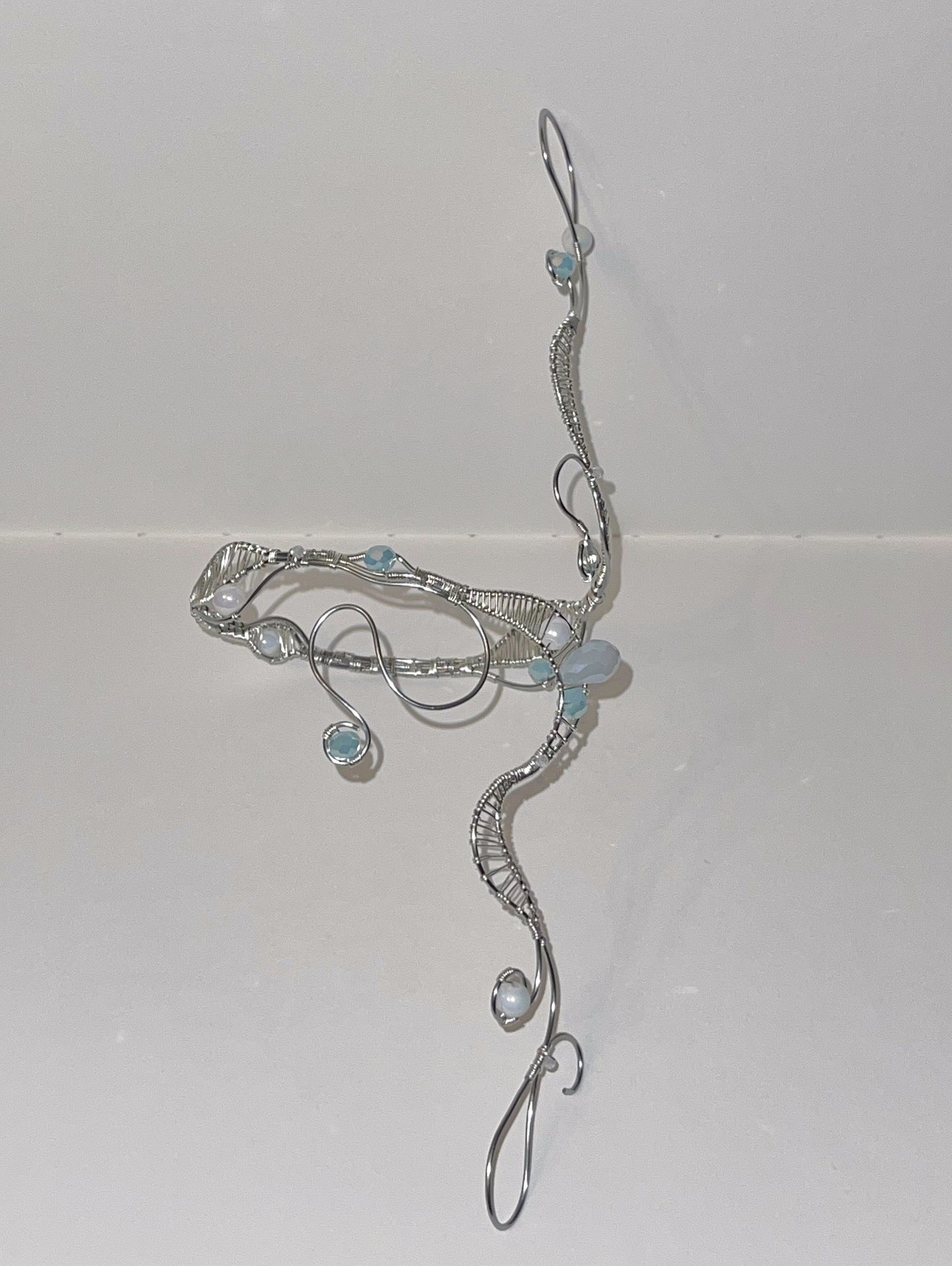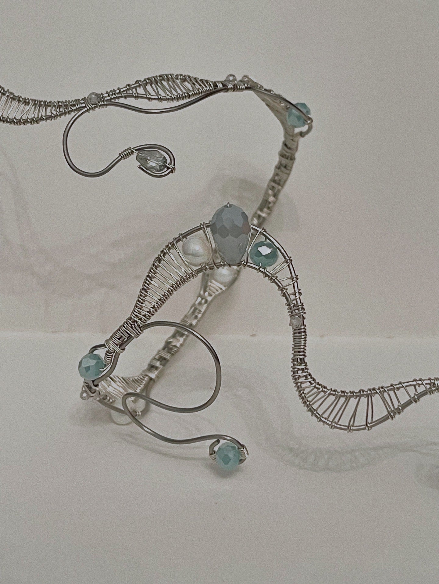 Made With White Porcelain Beads, Blue Glass Beads, Grey Tear Drop Bead, White Zircon, Silver Copper wire, & Stainless Steel Wire