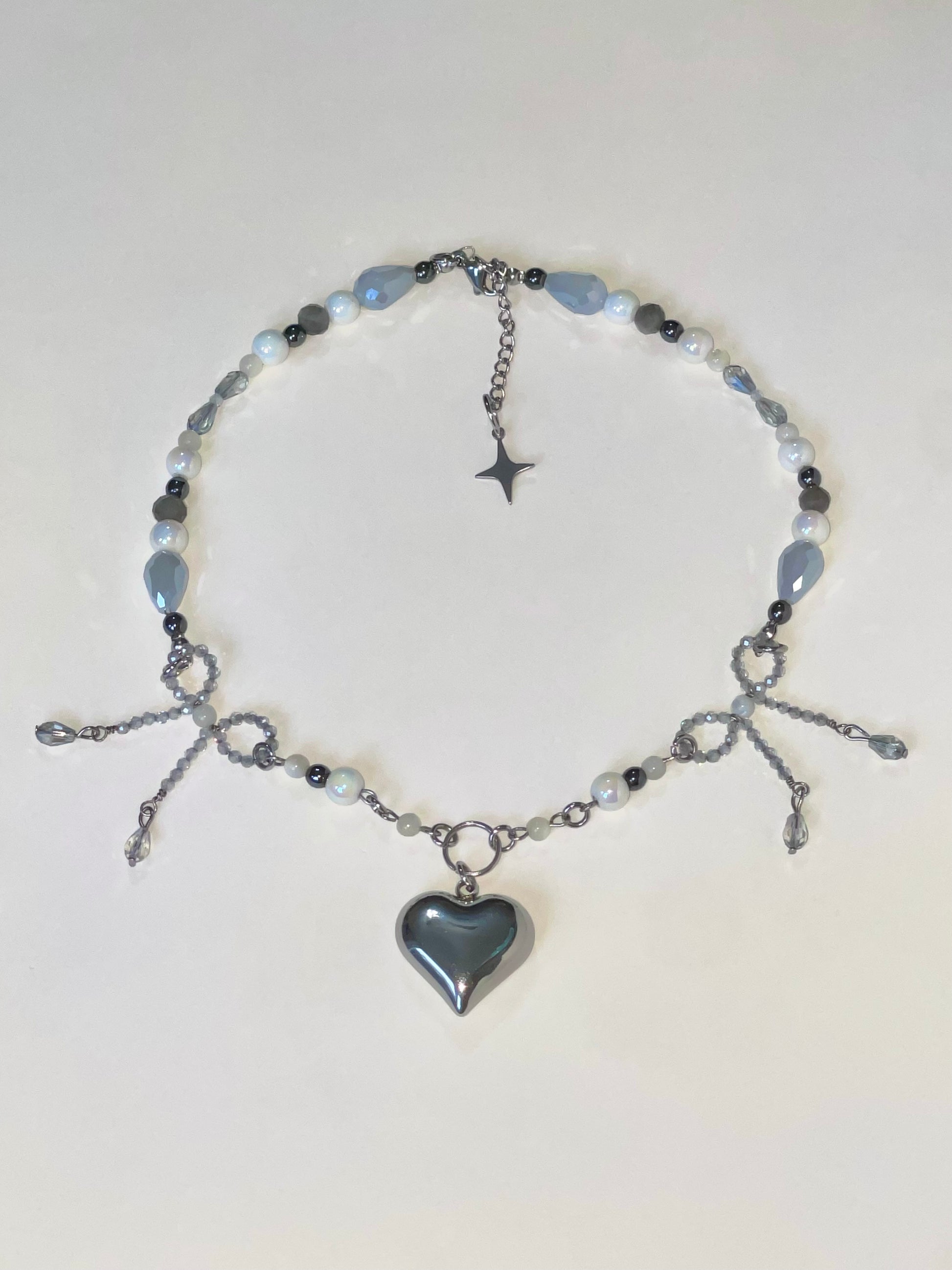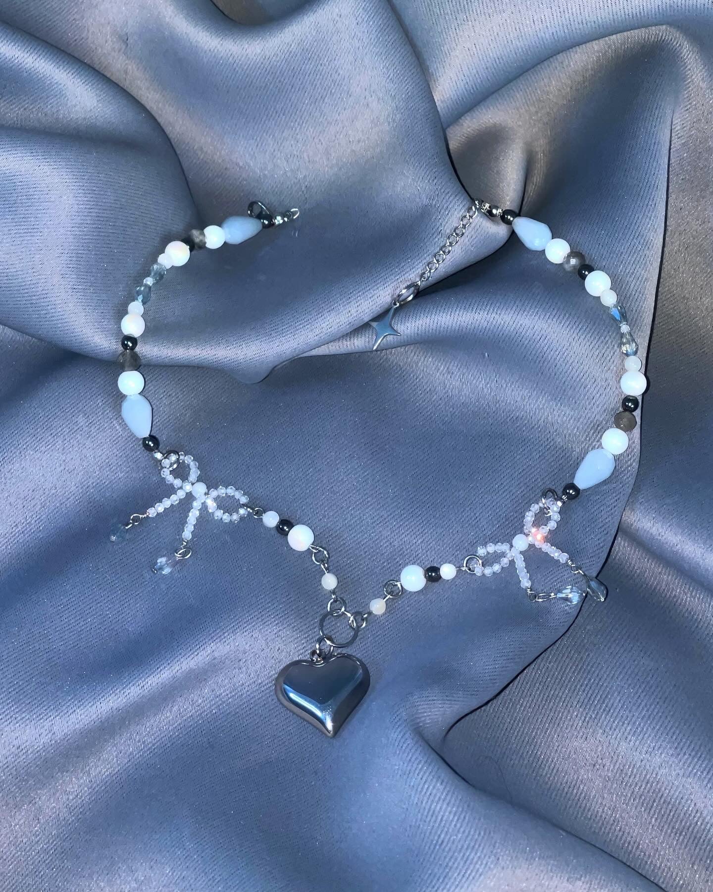 Made With Stainless Steel Heart Pendant, White Zircon, Black Hematite, White Pearl Shell, Gray Labradorite, White Porcelain Beads, Gray Tear Drop Glass Beads And Transparent Gray Tear Drop Beads.