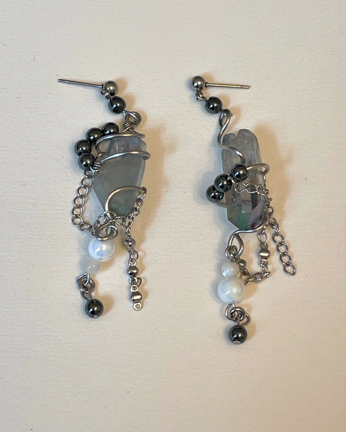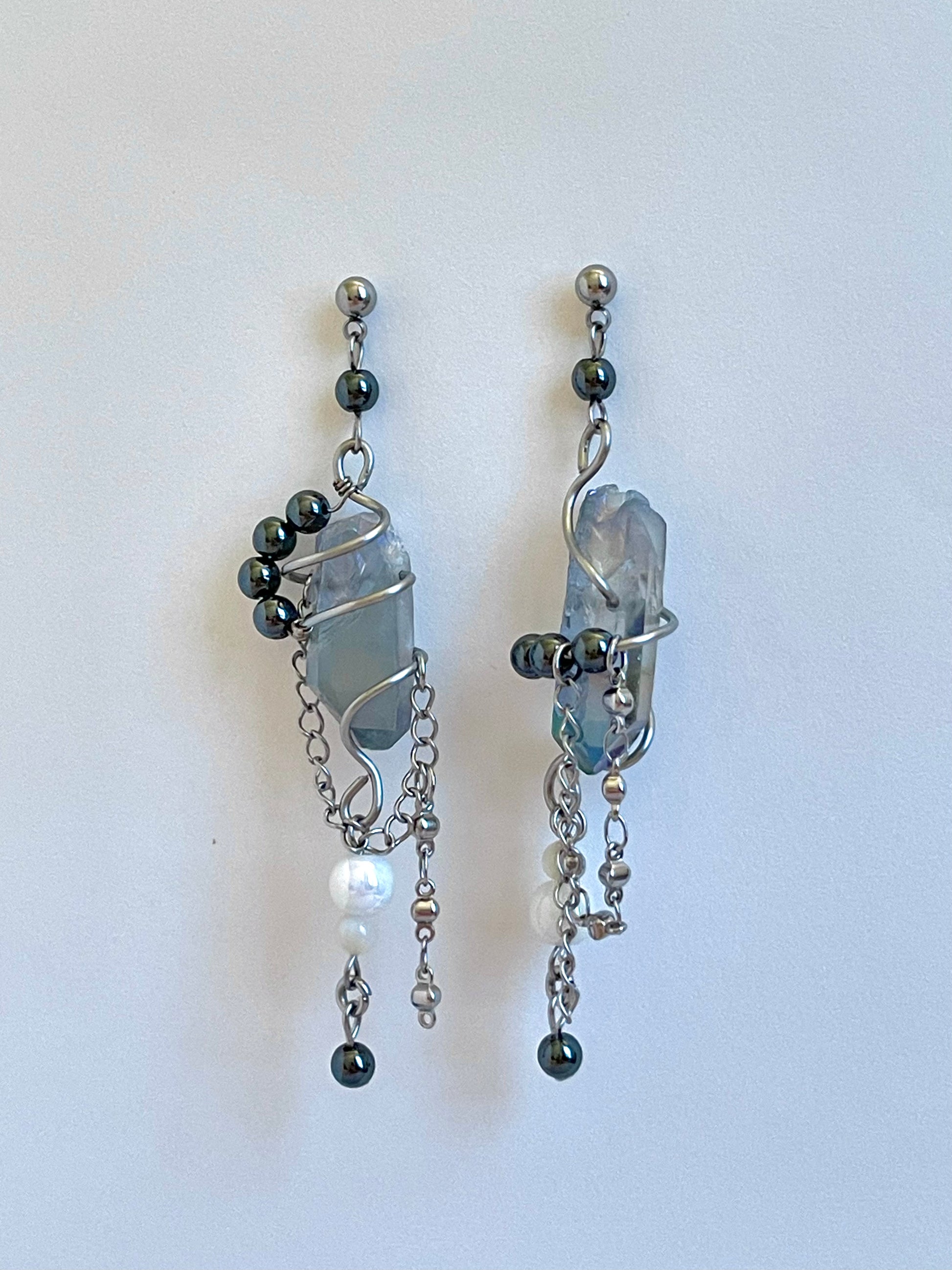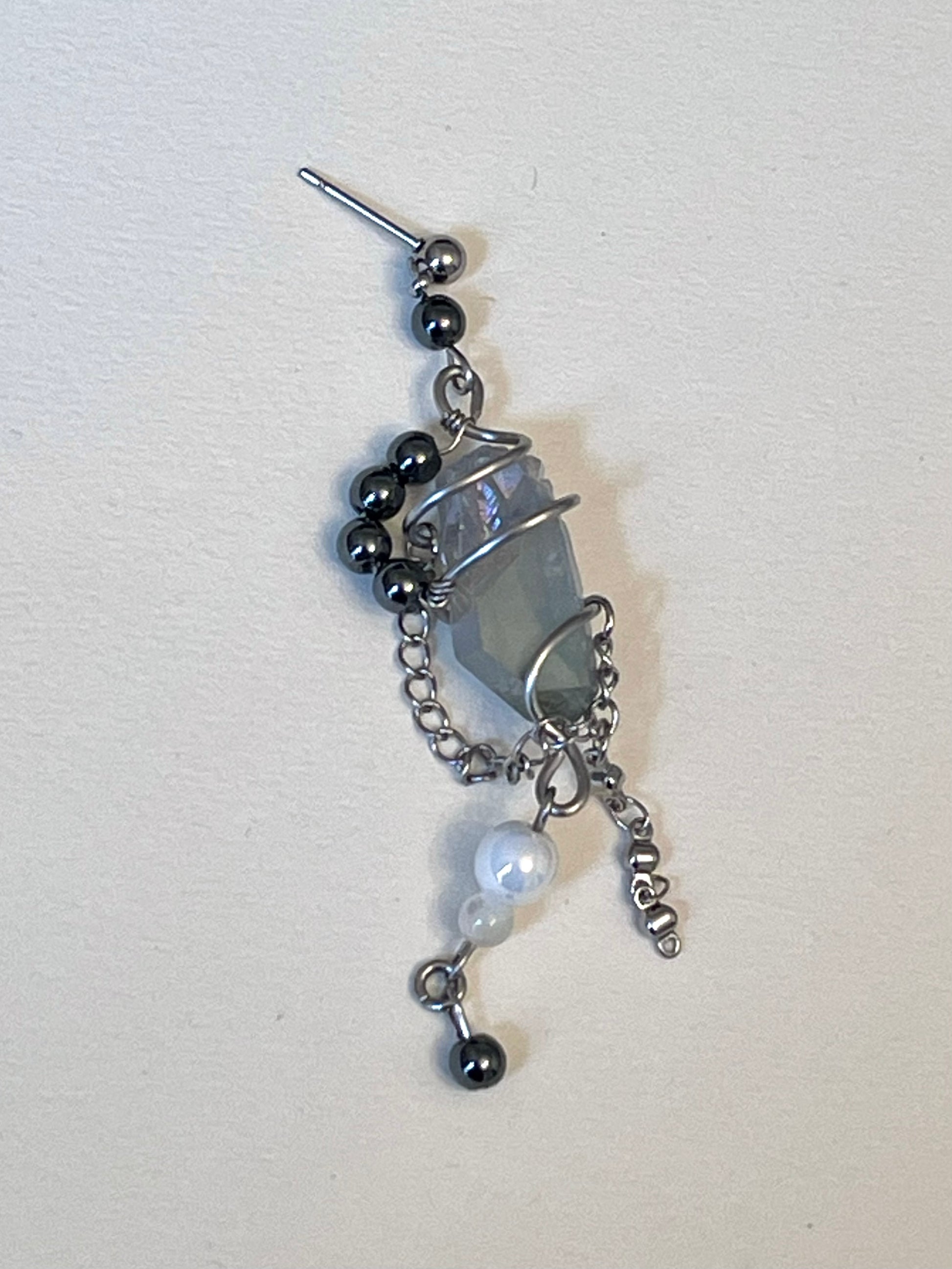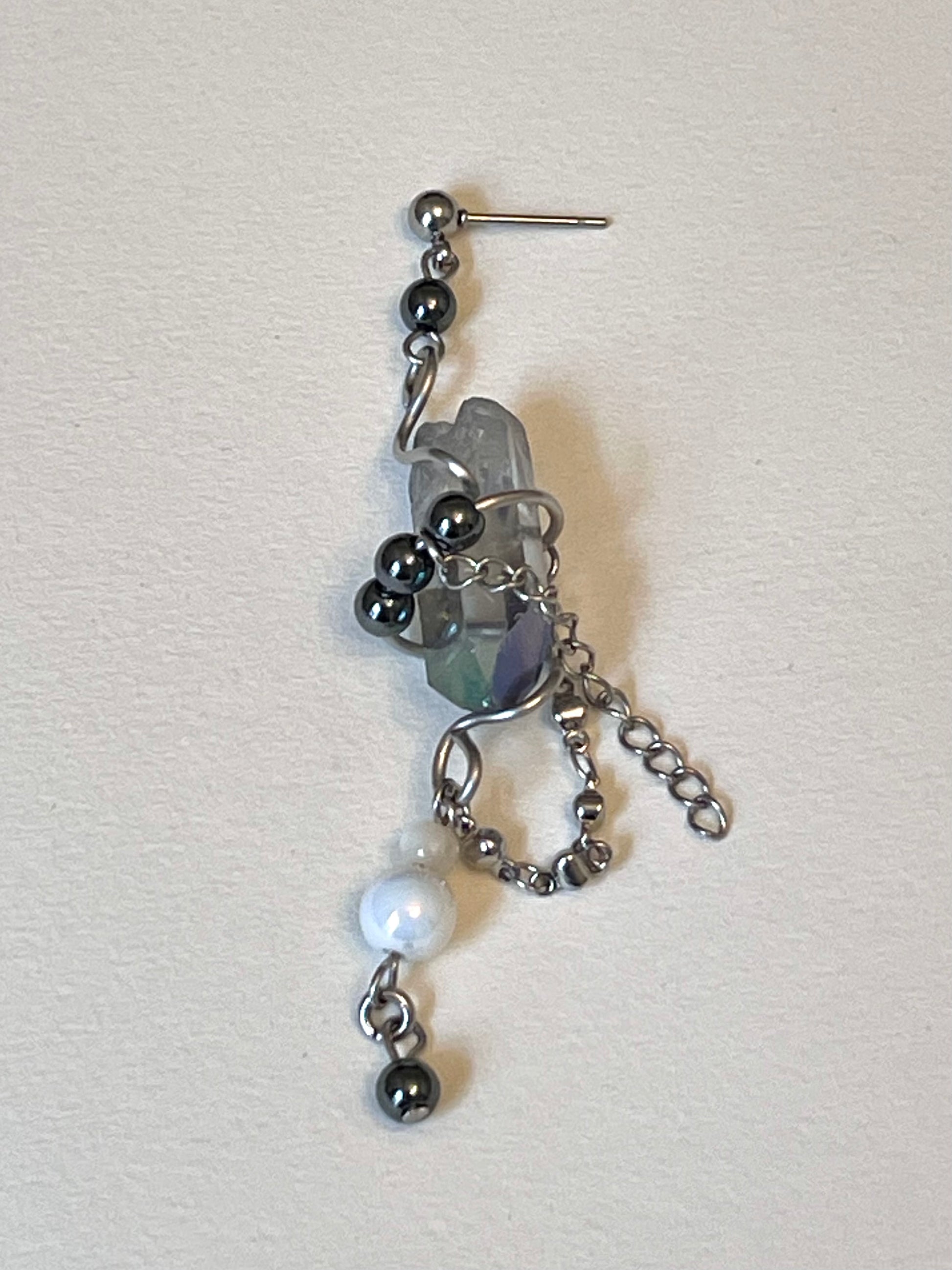 Made With White Porcelain Beads, White Pearl Shell, Black Hematite, Stainless Steel Chains, Stainless Steel Wire, Silver Copper Wire & Clear Lavender Titanium Quartz.